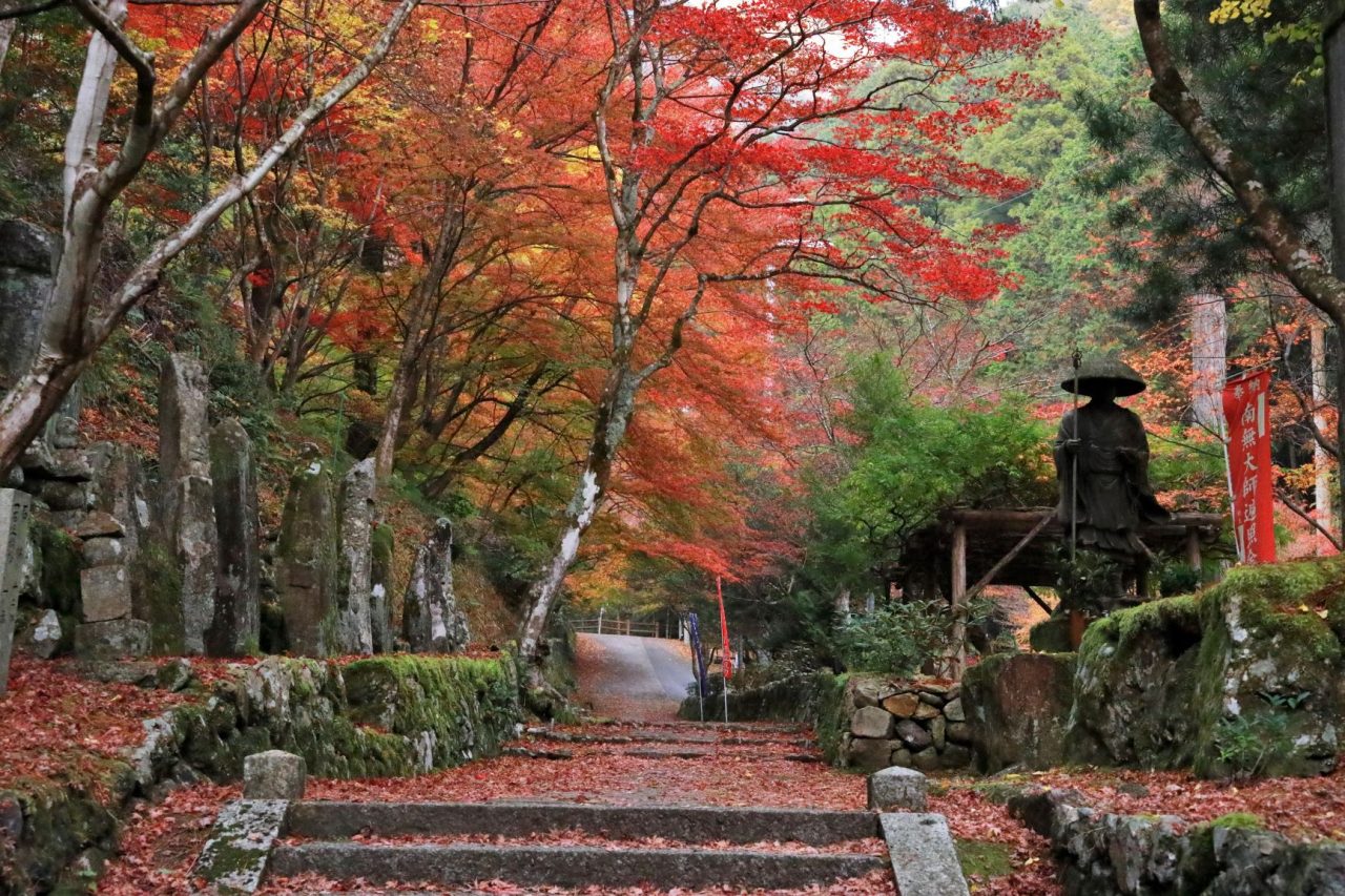 - 午後:さらに足を延ばして「石龕寺」へ 車を30分ほど走らせ、山門で見事な金剛力士像が出迎える石龕寺(せきがんじ)へ。苔むした石段と鮮やかな紅葉のコントラストは、まさに日本の秋の原風景です。